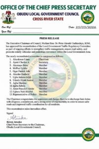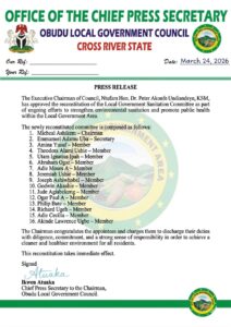 The Executive Chairman of Obudu Local Government Council, Hon. Ntufam. Dr. Peter Akonfe Undiandeye, KSM, has approved the reconstitution of the Local Government Sanitation Committee and the Traffic Regulatory Committee as part of ongoing efforts to strengthen environmental sanitation, enhance public health, and improve traffic management within the area.